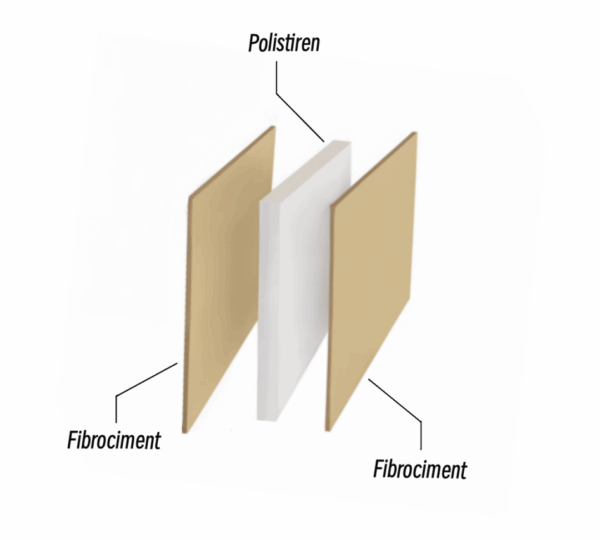 1250/2500/116 Panoul este creat din 2 foi de fibrocement din fibre de ciment cu amestec de quartz,cu grosimea de 8mm si un miez de polistiren expandat EPS 100 de 100mm